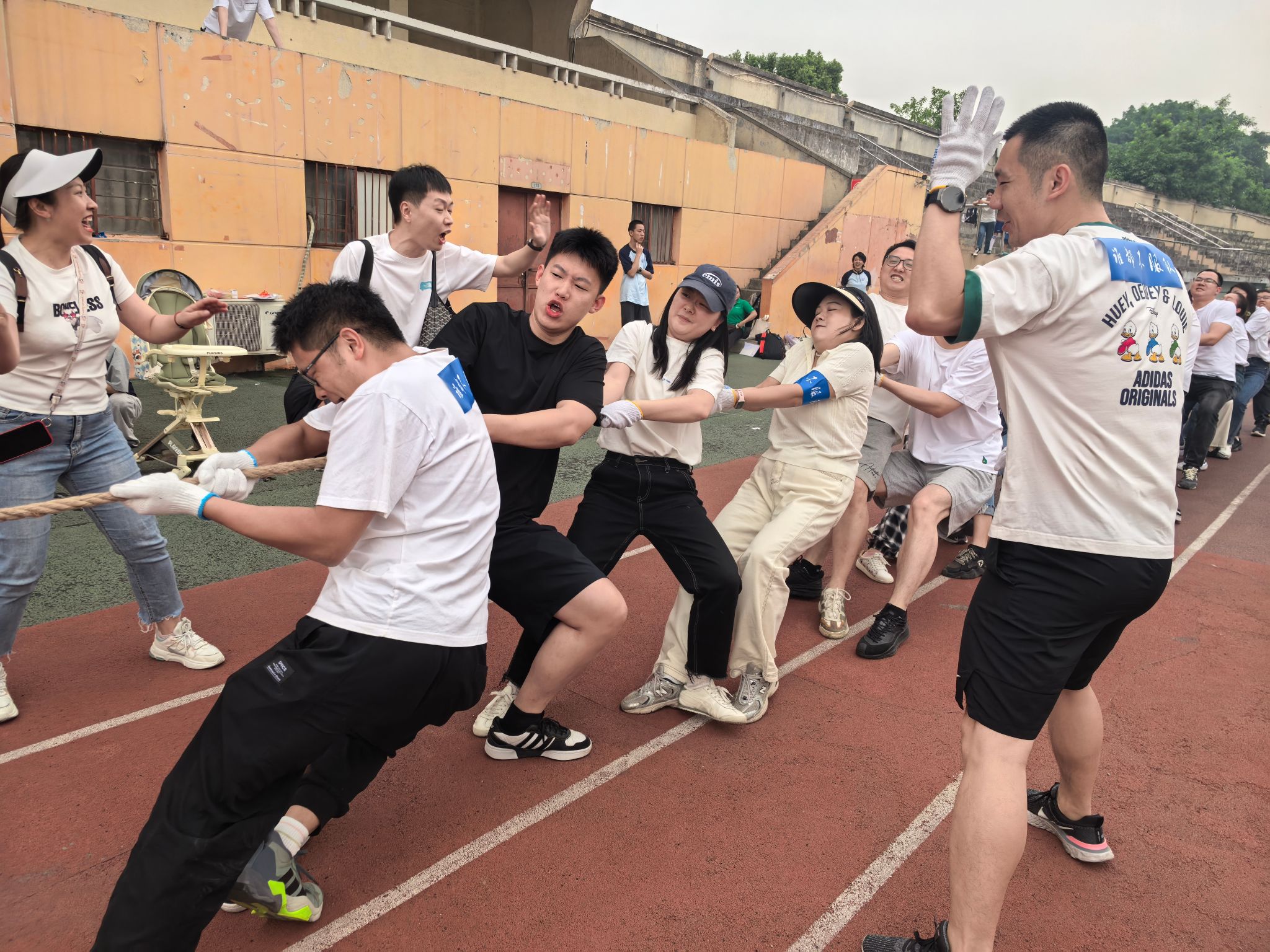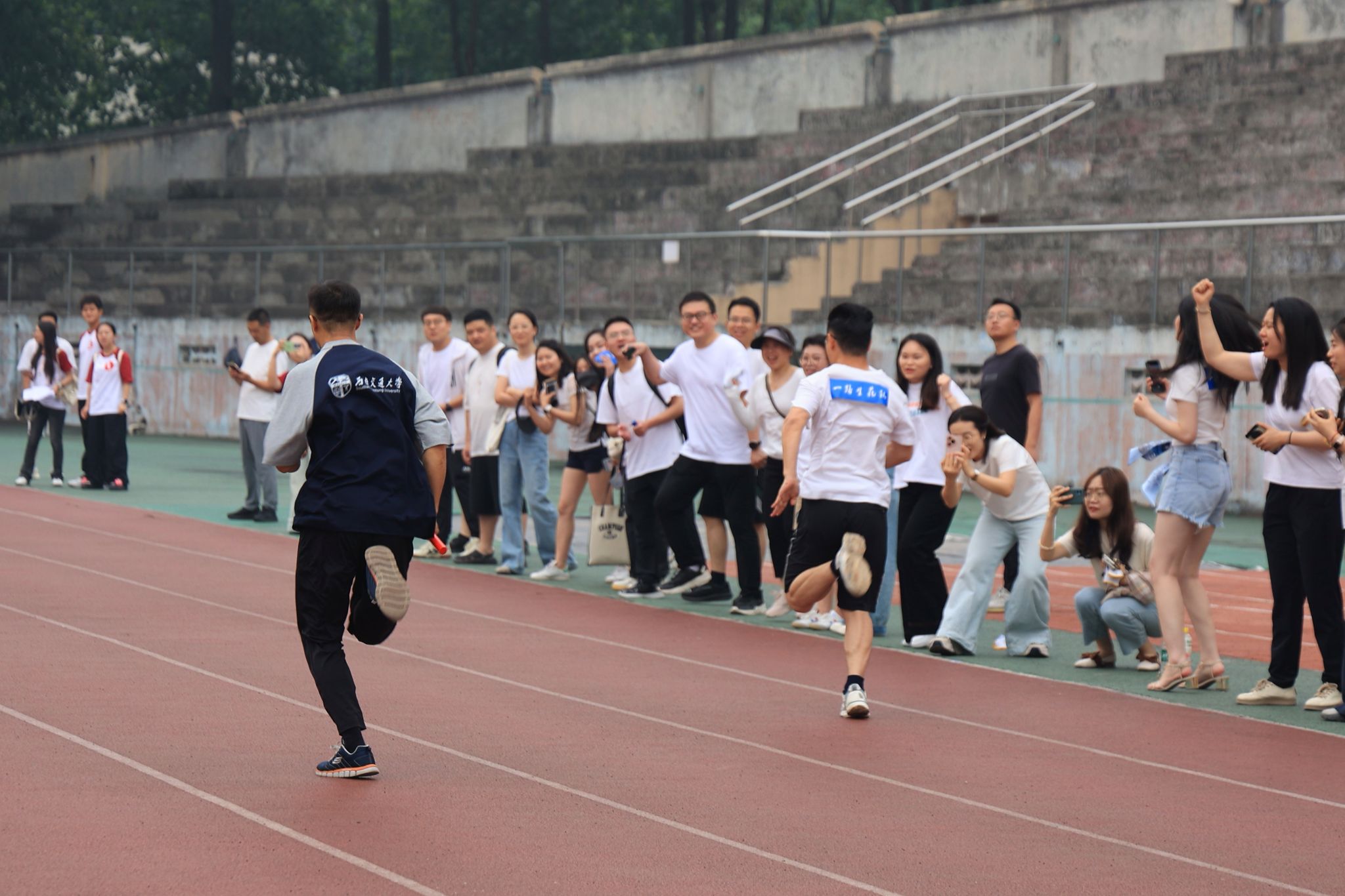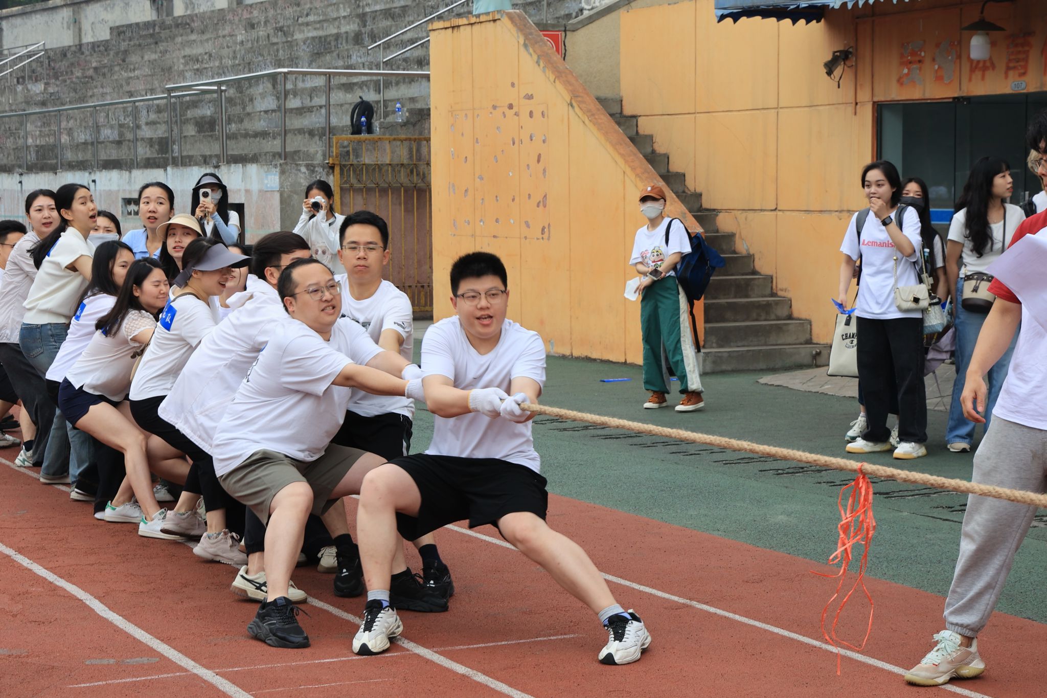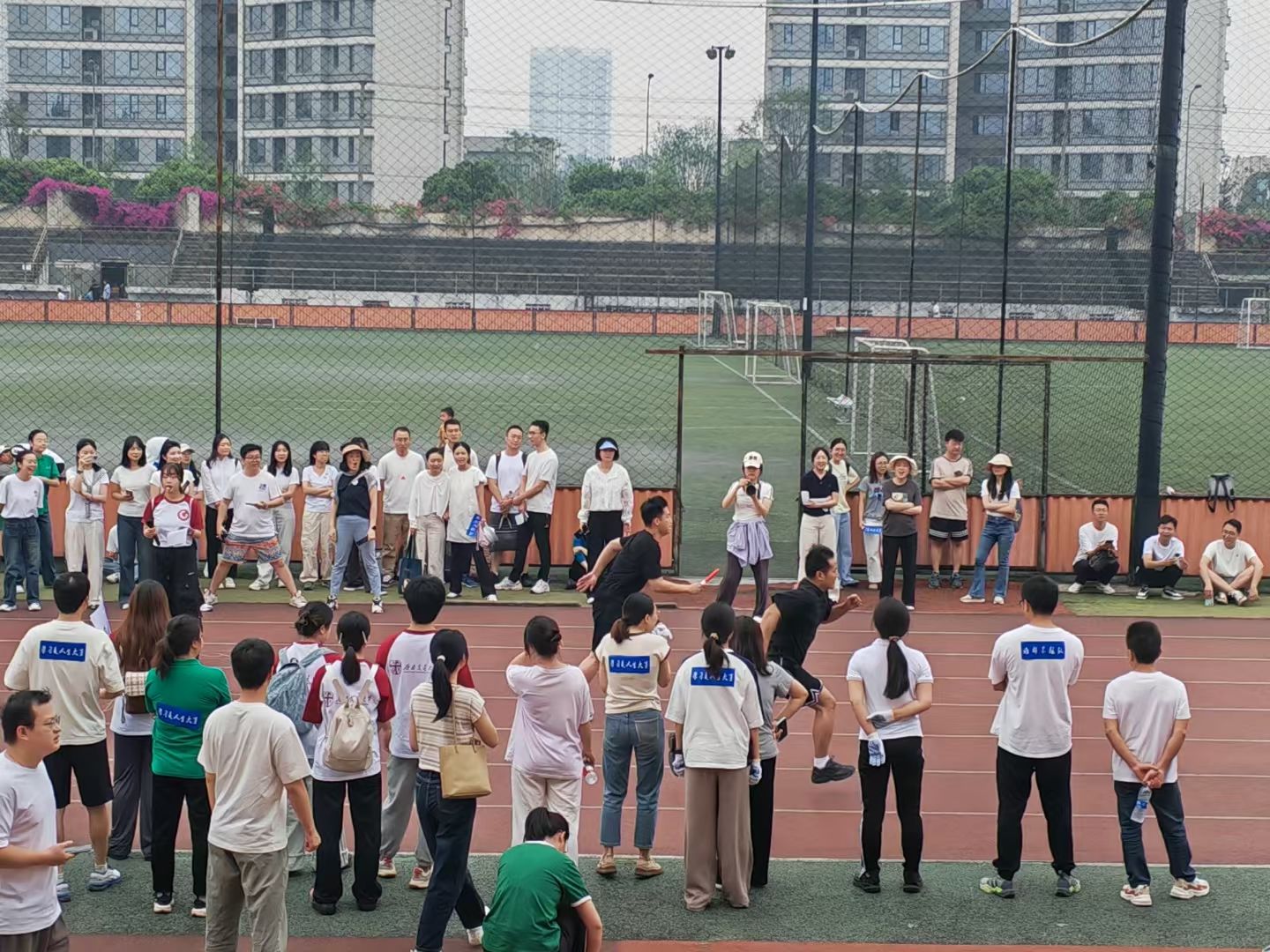 此次校庆主题日活动场地分布在足球场和詹天佑体育馆,多个趣味项目依次开展。2024级MPA员工组建的四支队伍(学习是人生大事队、谁都不服队、一路生花队)及员工代表队、教工代表队共六支队伍在各赛场上奋力拼搏。足球场作为活动的主场地之一,“蛇舞递辉”接力赛和“蛇曳争锋”拔河赛在这里激烈角逐。