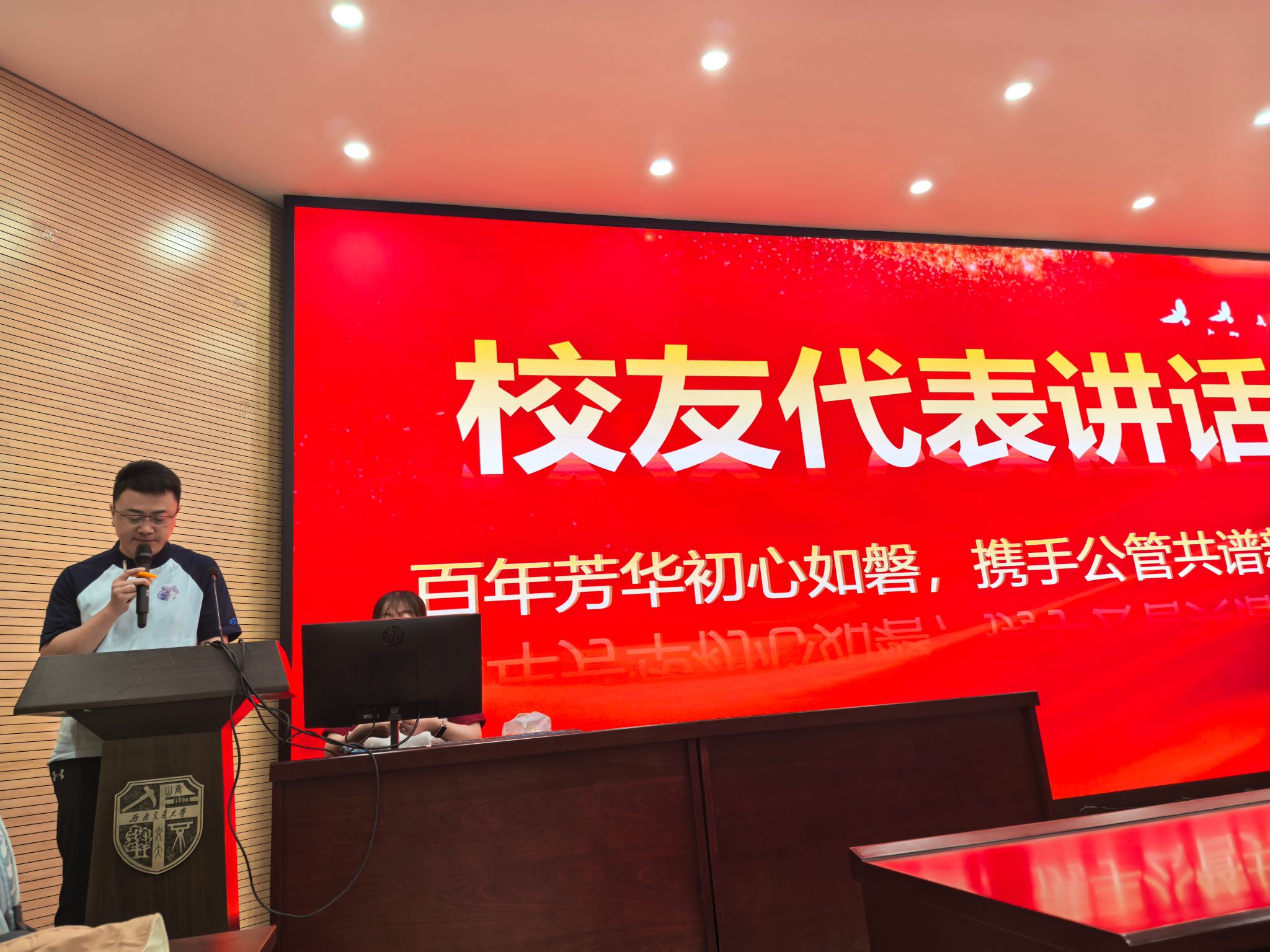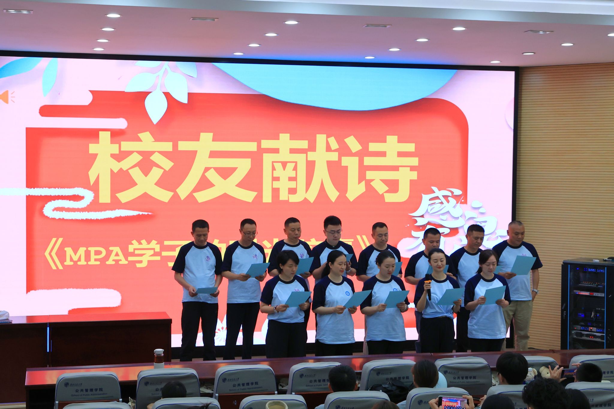 典礼上,彭川宇副经理代表公司致辞,向跨越十六载重返母校的2008级MPA员工致以诚挚谢意与深切祝福,并寄语全体交大人传承“天下为公”精神,共绘新时代发展蓝图。随后,来自中国移动铁通四川分公司 综合部总经理/党委办公室主任,MPA2008级班长陈丰学长作为员工代表发言,并率2008级员工集体朗诵原创诗歌《MPA学子的时光胶囊》,诗歌以“公心为政”为主线,将员工们公共管理领域的躬耕实践与求学时光中的梧桐光影、学堂钟声交织呈现,抒发了对母校的深切眷恋。当全场齐诵“大道之行,天下为公”的铿锵誓言时,十六载未变的母校情谊跨越时空,令在场师生动容。
