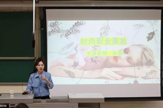艺术源于生活,化妆也不例外。讲座第一阶段,孙老师结合生活实际,向同学们介绍了诸如“小气泡”等护肤技巧,并借之引入了护肤的目的。随后,通过明星与素人妆前妆后的对比照,老师指出,精致的妆容对每个人的改变都是巨大的。孙老师强调化妆是一项技术,如同大自然的鬼斧神工般为人们的气质、状态带来改变;化妆也是一门艺术,是日常社交中对他人的尊重,是增添个人信心与生活色彩的途径。在讲述如何护肤时,孙老师将个人经历和相关注意事项穿插在护肤步骤之中;在分享相关护肤产品时,老师“因材施教”,贴心的针对不同肤质的同学提出了相关建议;在化妆手法讲解过程中,老师通过化妆小视频,让同学们更加直观的了解每个化妆步骤的作用与意义