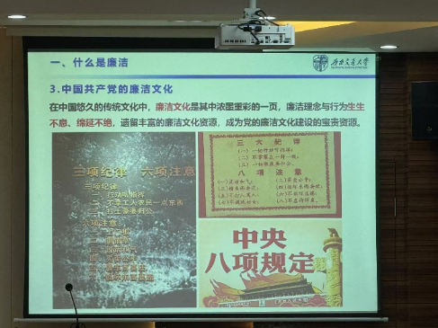 接下来,胡博老师分别从“什么是廉洁”“为什么要廉洁自律”和“如何做到廉洁自律”三个部分展开本次课程的主要内容。“宁廉洁正直,以自清乎?”在第一部分中,胡博老师首先从说文解字的角度解释廉洁的概念,通过大家耳熟能详的故事介绍廉洁的丰富内涵;揭示了我国源远流长的廉洁文化传统,激发了学员们对中华优秀传统文化的认同感与自豪感。胡博老师着重介绍了中国共产党的廉洁文化,展示了党反腐倡廉的坚定决心,加深了学员们的理解和感悟。
