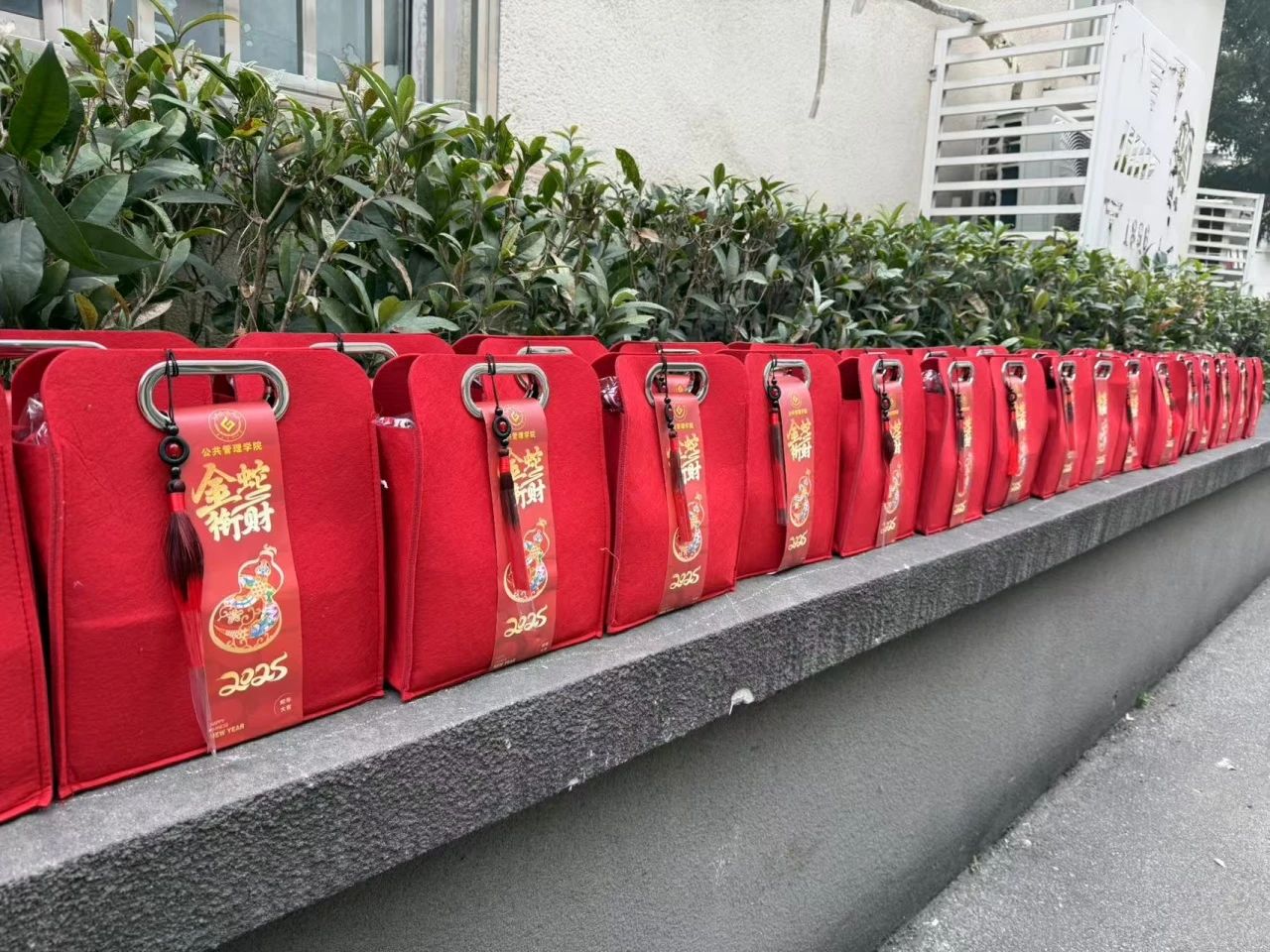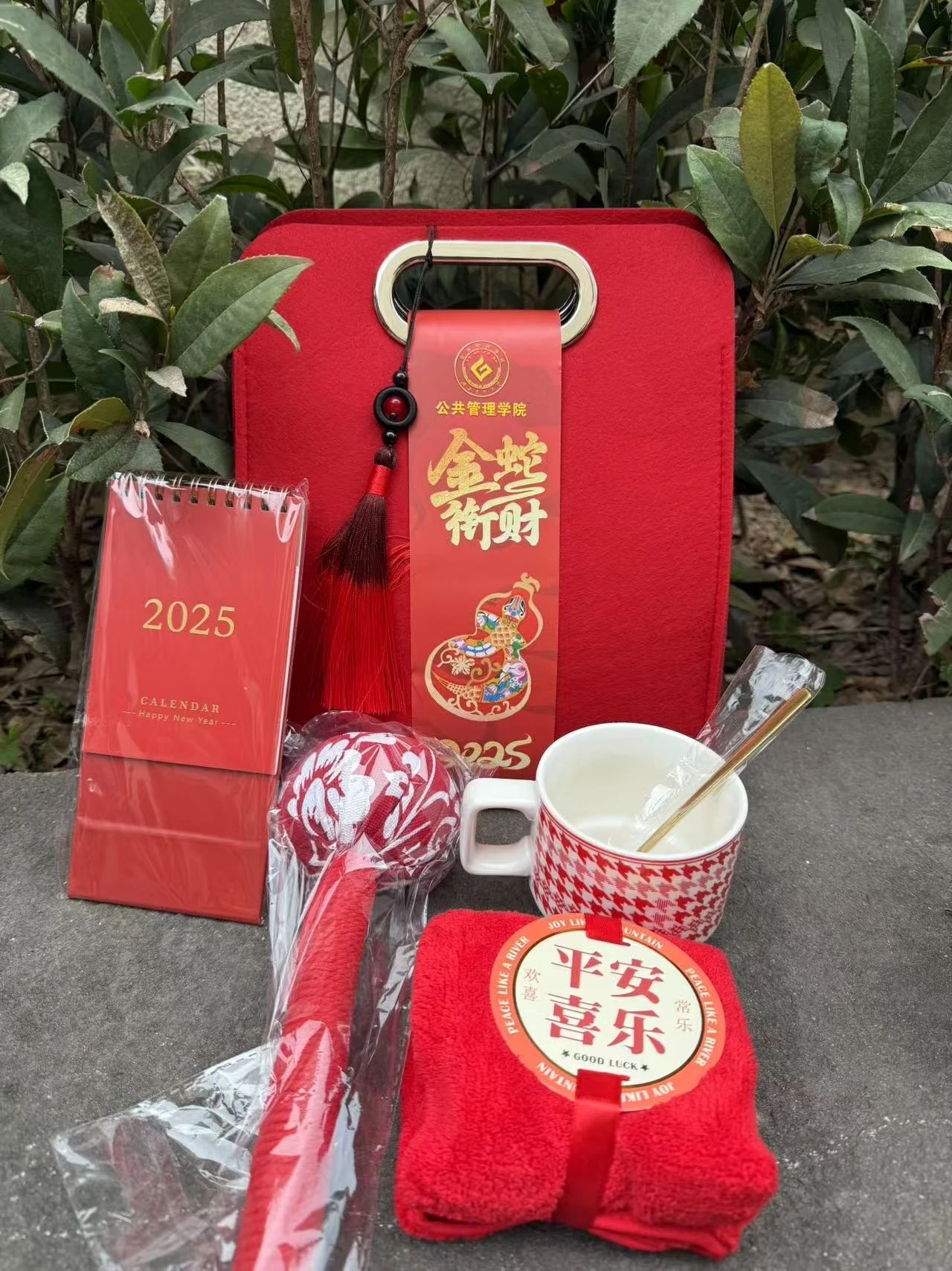 公司为每一位寒假留校的学子精心定制了新春大礼包,包含2025台历、艾草锤,平安喜乐方巾、冬日暖心水杯、金蛇衔毛毡包。火红的色彩在寒风中传递着温暖,不仅承载着公司对寒假期间留校员工的关怀,也象征着公司对学子们新年新气象的美好祝福。