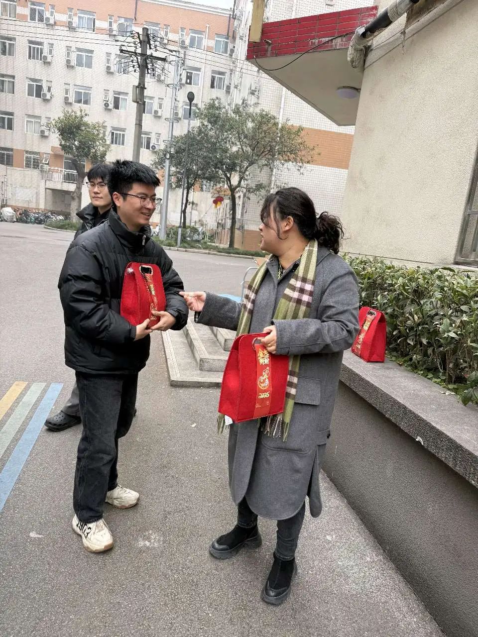 老师们为全院留校员工一一发放了慰问礼包,并代表公司祝福留校同学新春快乐,叮嘱大家留校期间注意人身和财产安全,遇到任何困难及时向辅导员和公司进行反馈。