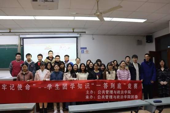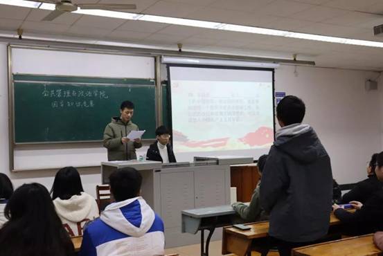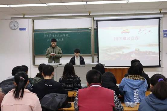 2019年12月12日16:00,为学习贯彻党的十九届四中全会精神,继承和发扬“五四”运动的光荣传统,激发团员员工爱国热情,公共管理与政法公司于九里校区逸夫馆J4307举办团学知识竞赛。公司党委余小英副书记,2017级辅导员许楠老师,2018级辅导员唐明老师出席本次比赛。