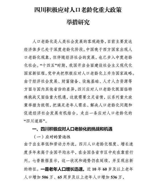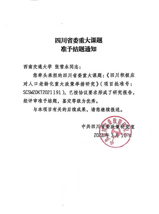 近日,公司张雪永经理牵头承担的四川省委重大课题:《四川积极应对人口老龄化重大政策举措研究》顺利完成,鉴定等级为优秀。