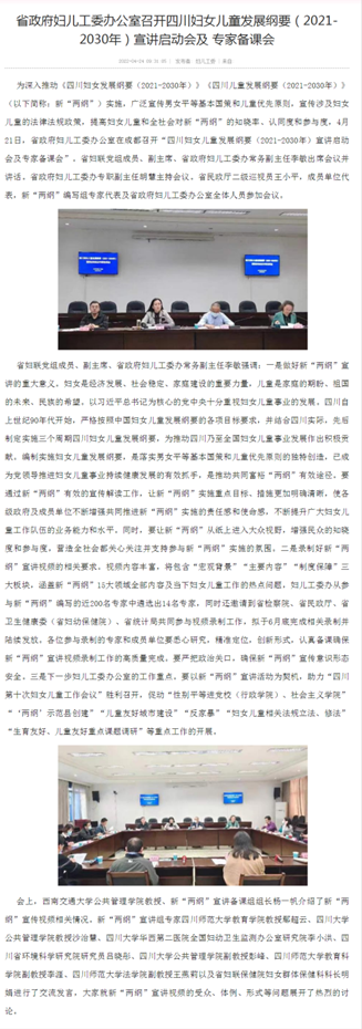 受四川省政府妇女儿童工作委员会委办公室委托,国际老龄科学研究院副经理、老龄事业与产业发展研究中心主任、新“两纲”宣讲备课组组长杨一帆教授,牵头组织开展“四川妇女儿童发展纲要(2021-2030年)宣讲启动会及专家备课会”工作。省妇联党组成员、副主席、省政府妇儿工委办常务副主任李敏出席并作指导讲话。